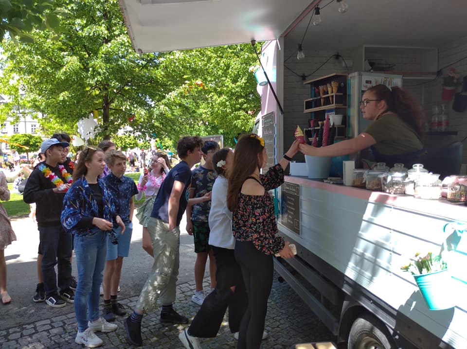 Po celou dobu se radostně hodovalo a atmosféru umocňovala havajská hudba. Kdo si občerstvení zapomněl, mohl si dát výbornou zmrzlinu z lichnovského Zmrzlinového krámku, který nám zaparkoval přímo před školou.